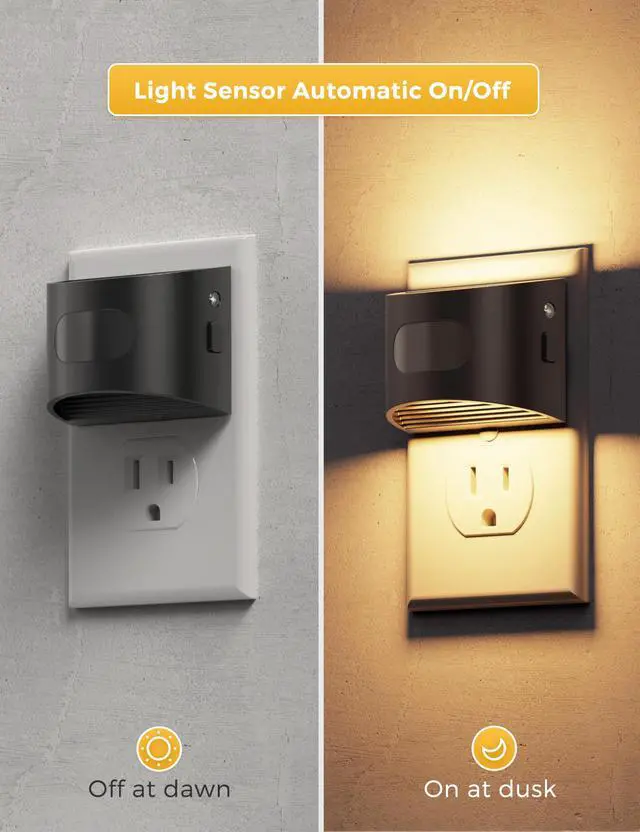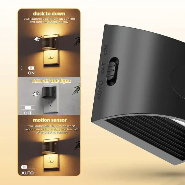 Motion Sensor & Dusk to Dawn: The plug in night light built-in motion sensor and dusk to dawn sensor. "ON" mode - Dusk to Dawn,automatically light up at night and turn off during the day,suitable for long-term lighting at night. "AUTO" mode - Motion Sensing,automatically turns on when motion is detected in the dark and turns off after 60 seconds of inactivity, is suitable for energy saving. You can choose "ON" or "AUTO" mode according to your actual needs