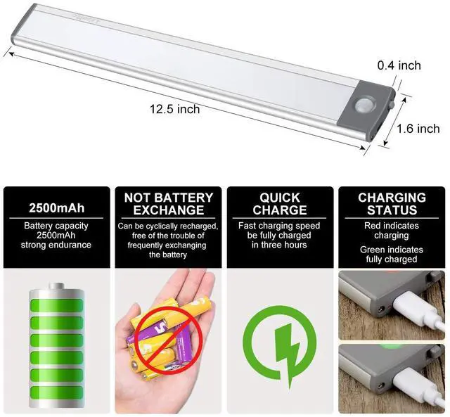 These led battery operated lights built-in 2500mAh high-capacity rechargeable battery, easily charged via the USB cable(included). After fully charged, the wireless under cabinet lighting can last for about 3 hours when you make it (ON)mode, and 2-4 weeks under motion sensor(G) mode(activate 10 times a day).