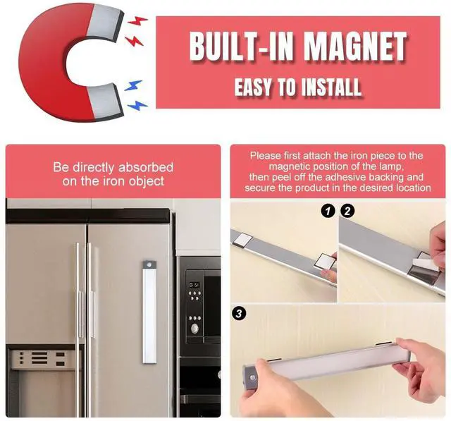 Easy to install:built-in Magnet to Stick on Any ironwork: This wireless motion sensor closet light can stick on any ironwork, or you can use the included adhesive tape to tape and iron sheet to stick on any non-iron article surface. When need charge or change place, you can the take closet light off anytime.