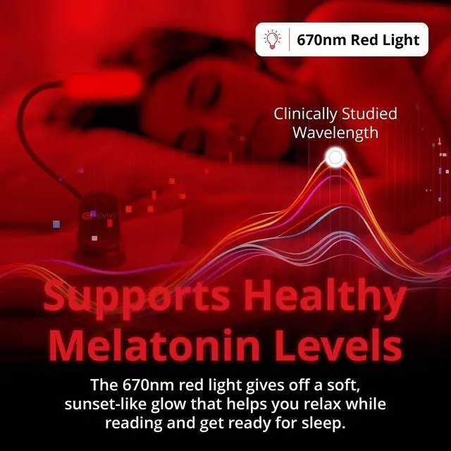 The 670nm wavelength promotes your body's natural product of melatonin, the hormone that plays a crucial role in regulating your body’s sleep-wake cycles. By promoting the natural alignment of your circadian rhythm, this specific wavelength helps signal to your body that it’s time to relax, making it easier to fall asleep quickly and experience deeper, more restorative rest. Safe, non-invasive, and easy to use, our lamp provides a natural and effective solution to improve your sleep quality and boost relaxation.