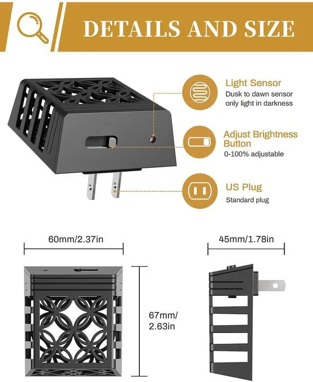 - AUTOMATIC ILLUMINATION - With smart dusk to dawn sensor, the night light will auto turns on at night or when ambient lighting becomes insufficient.Emitting gentle light that is easy to your eyes, while bright enough to light up your way in the darkness.