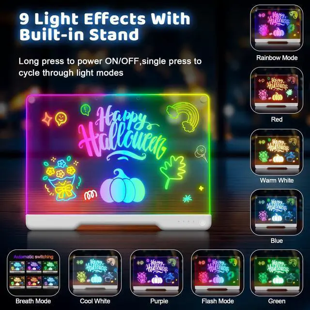 16-Inch Rechargeable Doodle Glow LED Note Board, 9-Color Light Modes, Neon Art Dry Erase Light Up Drawing Pad with Built-in Stand, Sketching Gift Toy for Kids/Girls/Teens, 7 Markers & Tracing Book
