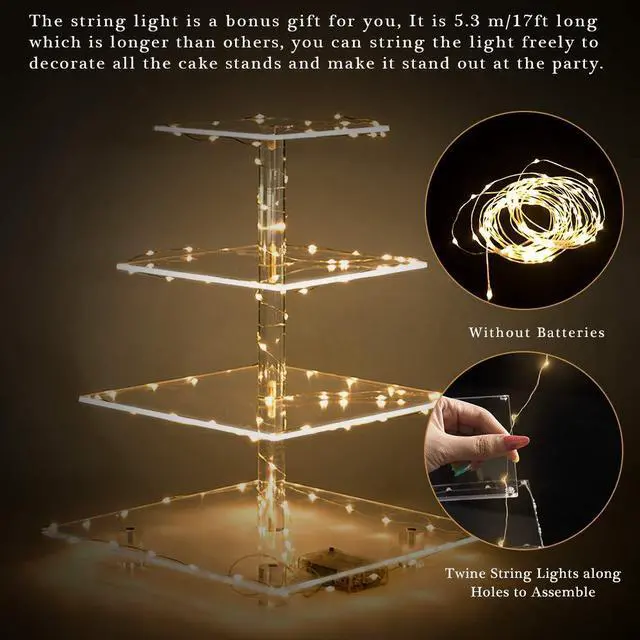 Hold end of the string light without battery box and cross holes of bottom layer, then enwind the light string on the acrylic rod. Repeat the above steps layer by layer, Finally you will complete the string light by four holes beside the plate corner on the top layer.