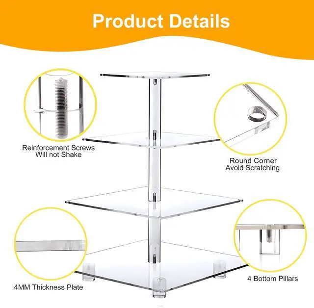 Dimensions of the Four-layer Acrylic Plates: 12/10/8/6”.It has rubber dots on the bottom for more stability.It is made with 4 mm acrylic plates that are sturdy and resistant.
