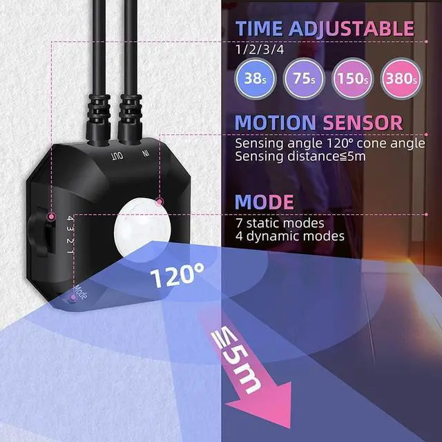 - The auto-off timer of the LED light strip motion sensor can be set from 38 seconds to 380 seconds. Auto-on within 16.4 feet, auto-off after 38/75/150/380 seconds of no motion detected. You can set your time as deemed appropriate.