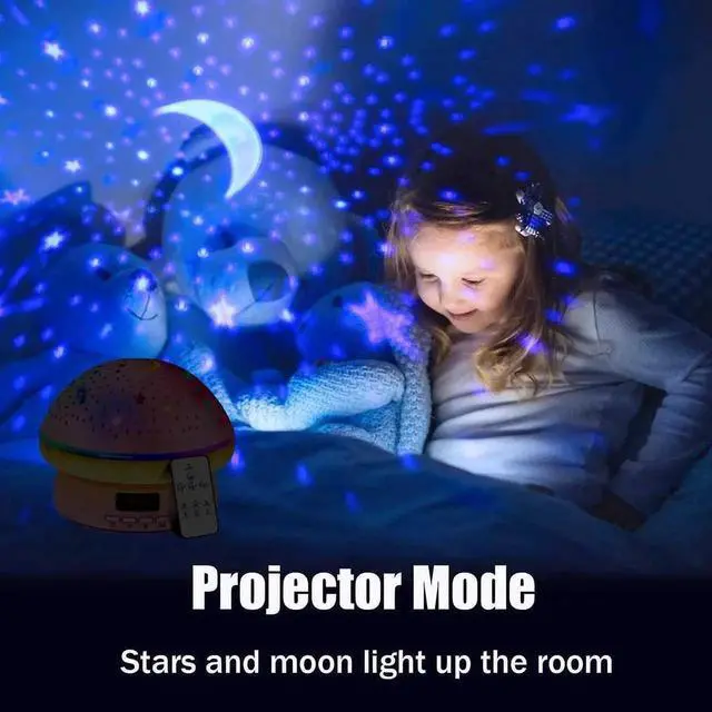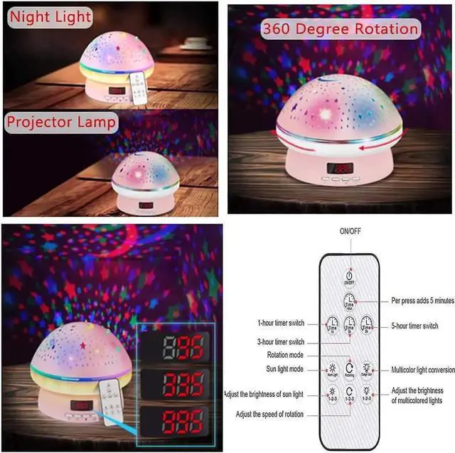 Timer Design: The New generation star night light supports 5-999 minutes to set the time control as your preference. The night sky projector will turn off automatically when the set time is ended, it would not disturb you or your babys sleep. Also, it is cute mushroom design. ^