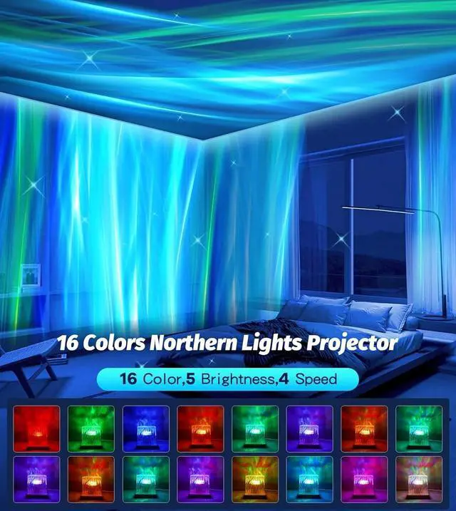 Ceiling Northern Lights for BedroomThis northern lights projector galaxy projector features 16 colors*5 brightness*4 speed transforming yr bedroom into a splendid wonderland,creating a relaxing atmosphere.Perfect improved sleep for kids&adults,this galaxy light projector creates an ideal atmosphere for yr bedroom decor,serving as a night light & mood lighting.U can decide how bright what colours or colour U want to go with U decor.The crystal aura lamp& mood lighting bedroom lights for ceiling projector is wonderful for teen girls fall asleep,creating a relaxed atmosphere in yr bedroom!Cool Northern lights for bedroom perfect to set the vibe for sleep,work,relax,dating ect.