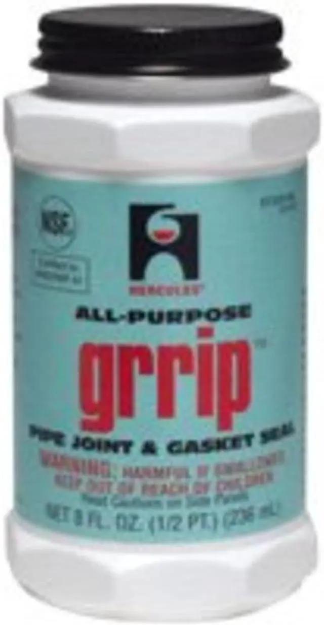All-purpose pipe joint and gasket sealing compound for use on metals including aluminum, black iron, brass, copper, stainless Steel, galvanized Steel and on plastics including pvc. Grrip sets up quickly and dries to form a very tough, yet flexible seal which will not harden, crack, crumble or shrink. Provides leak-proof resistance to high pressure, temperature, expansion, contraction and extreme vibration. Joints can be disassembled easily, Without damage to pipe or equipment. Grrip can be removed from skin or clothing, tools or equipment with isopropyl alcohol or Hercules for HandsTM Hand Cleaners. Product Features Include: All-purpose, tough, pliable, non-petroleum based seal; Will not harden, crack, crumble or shrink; Sets up quickly and dries to form a very tough, yet flexible seal; Ideal for sealing jobs in plumbing, heating, piping, air conditioning, refrigeration, automotive and innumerable industrial applications; Grrip is applied easily with the natural bristle brush even at temperatures as low as +20 Deg F; It provides leak-proof hydraulic resistance to 12000 psi and withstands gas pressure up to 2600 psi; Grrip is a black colored thread sealant which contains no lead; Screw cap with brush