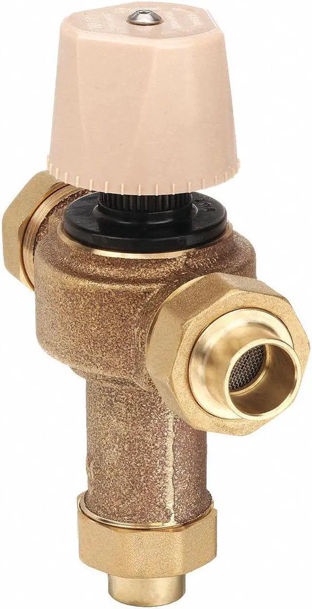 Thermostatic Mixing Valve, Body Material Brass, Flow Rate 0.5 to 23 gpm, Inlet Type Solder, Outlet Type Solder, Inlet Size 1/2 in, Outlet Size 1/2 in, Temp. Range 80 Degrees to 120 Degrees F, Max. Pressure 150 psi, Overall Height 5 3/8 in, Overall Width 4 7/8 in, Inlet Temperature (Cold) 39 Degrees to 85 Degrees F, Inlet Temperature (Hot) 120 Degrees to 180 Degrees F, Includes Check Valves, Integral Filter Washers, Solid Wax Hydraulic Principle Thermostat. This item has been restricted from sale in the following state (s): []