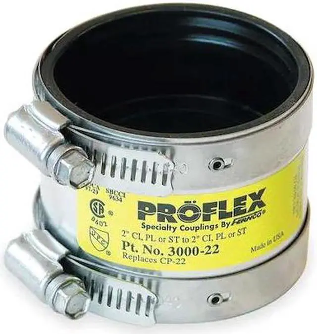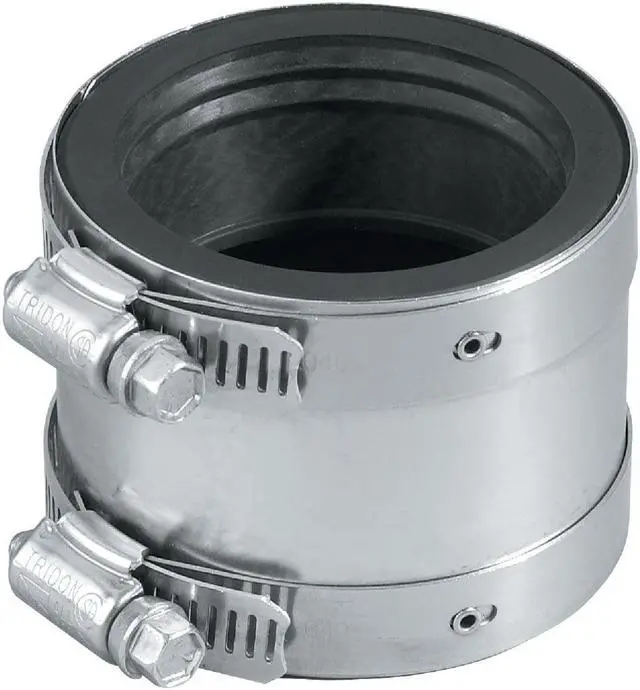 Provides a connection between cast-iron pipe and plastic, steel, or extra-heavy cast iron pipe without the use of bushings. The internal pipe stop insures proper installation and reduces noise and vibration. The outer shear ring and clamp assemblies conform to ASTMA A167-91.