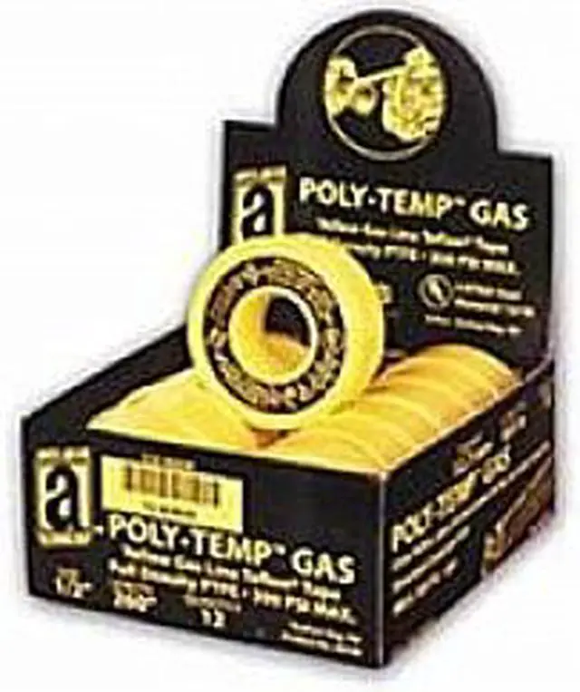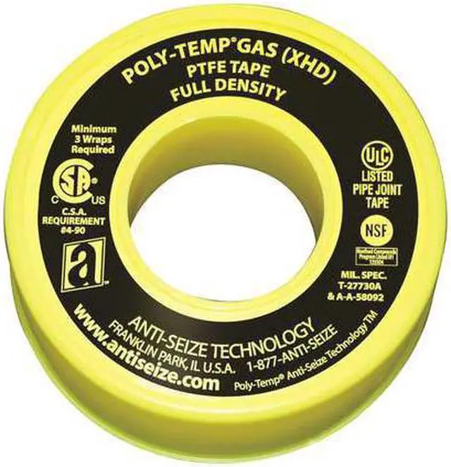 Thread Sealant Tape, Specific Sealing Application For Gas, Series POLY-TEMP (R) GAS (XHD), Overall Width 1/2 in, Overall Length 43 ft, Minimum Operating Temperature -400 Degrees F, Maximum Operating Temperature 550 Degrees F, Maximum Operating Pressure for Liquids 10, 000 psi, Maximum Operating Pressure for Gases 2, 000 psi, Maximum Linear Density 1.5 g/cc, Minimum Linear Density 1.2 g/cc, Color Yellow, Tape Type Pipe Thread Sealant Tape, For Maximum Thread Diameter 1/2 in. This item has been restricted from sale in the following state (s): []