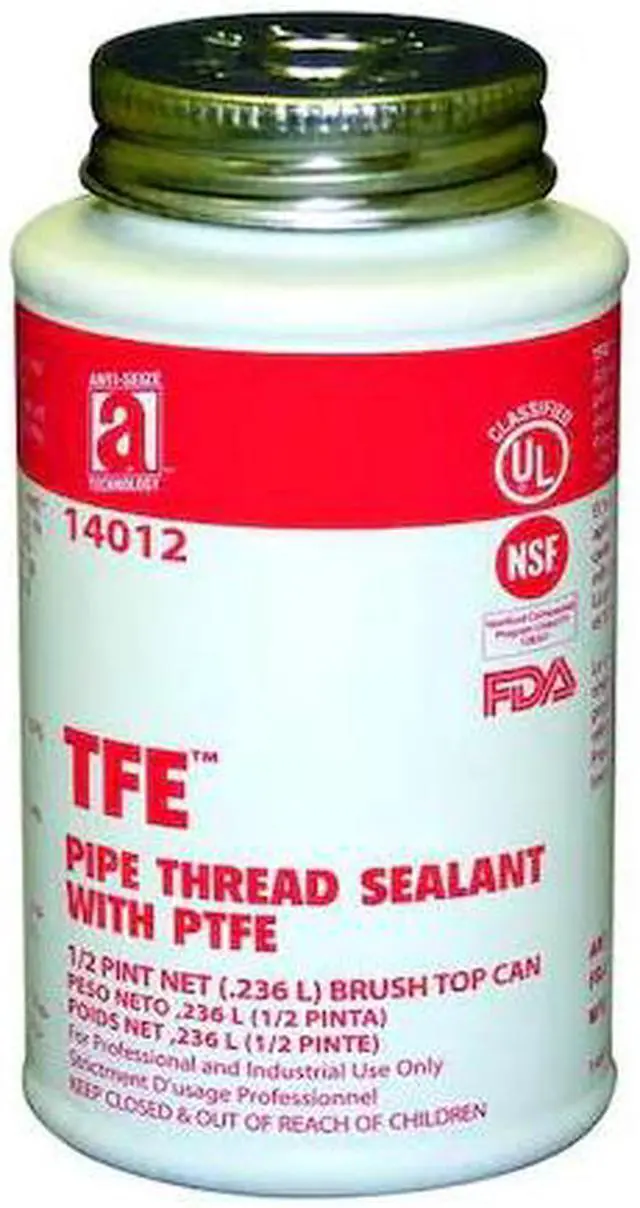 Pipe Thread Sealant, Cure Type Non-Hardening, Series TFE, Container Size 9.6 fl oz, Container Type Brush-Top Can, Maximum Operating Temperature 500 Degrees F, Minimum Operating Temperature -50 Degrees F, Maximum Operating Pressure for Gases 2, 000 psi, Maximum Operating Pressure for Liquids 10, 000 psi, Color Off-White, For Fluid Type Fuels, LP Gas, Oil, Steam, Water, For Material Type Brass, Cast Iron, Copper, Stainless Steel, Standards NSF #128341, UL Listed, For Maximum Thread Diameter 2 in.
