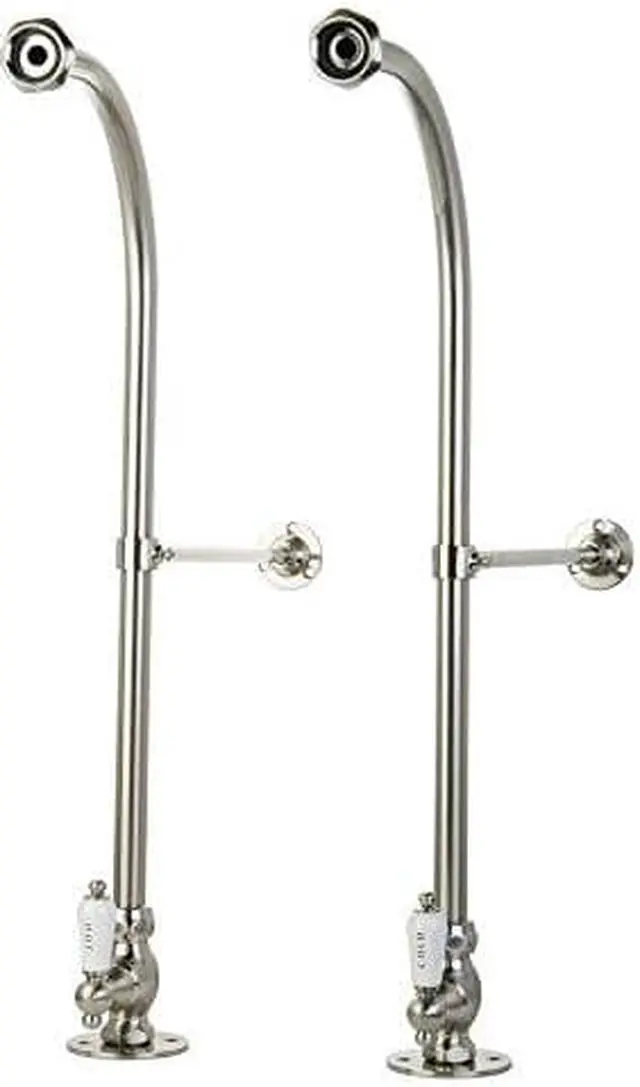 • Satin Nickel• This freestanding water supplies with stop comes in pairs and includes adjustable height wall braces. They are constructed of high quality brass to ensure reliability and durability. Its premier finish resists tarnishing and corrosion.• High Quality Brass Construction• Adjustable Height Wall Brace• 13-3/4 Wall Clearance• 1/4 Turn Ceramic Disk Cartridge• Premier Finish