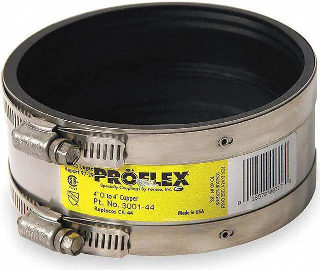 Shielded Transition Coupling, For Nominal Pipe Size 4 in, Neoprene, 4 in, 4 3/8 in, 4 3/4 in, Female, 4 in, 4 1/8 in, 4 3/4 in, Female, 2 1/8 in Overall Length. This item has been restricted from sale in the following state (s): []
