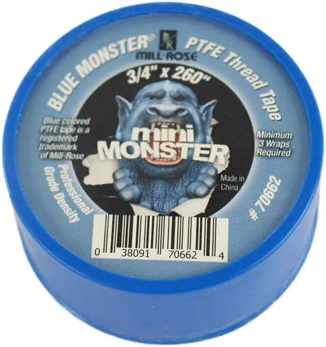 MILL-ROSE, 70662, 3/4" x 260" Blue Monster PTFE Thread Seal Tape, Plumbers Teflon Tape. Blue Monster PTFE Thread Seal Tape is a thicker, denser, general-purpose thread seal tape that comes in a monstrous 260" roll. Thats 5 times more tape than conventional rolls of low-density thin tapes. Fewer wraps are necessary to affect a leak-proof seal and it applies easily. No waste and no re-taping make sealing joints a breeze. Now available in a smaller roll, Mini-Monster PTFE thread sealant tape. Blue Monster thread sealing tape is manufactured from PTFE resin, a polymer consisting of recurring tetrafluoroethylene monomers whose formula is (CF2-CF2)n.