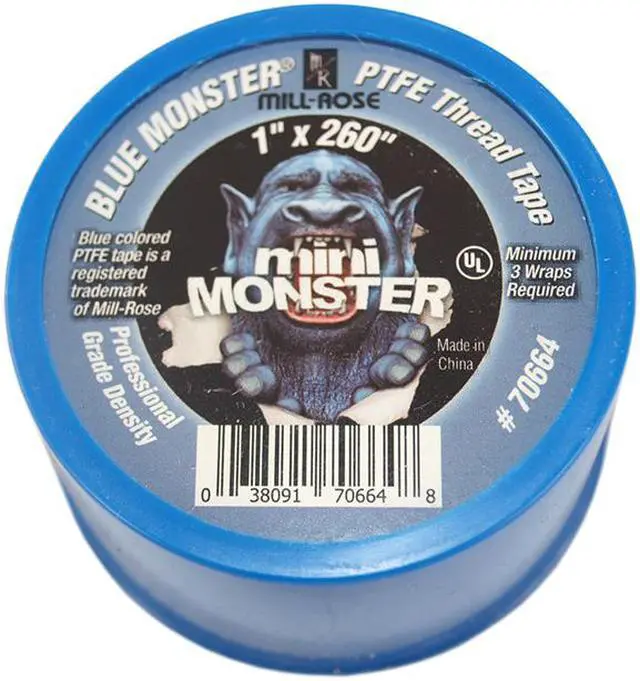 MILL-ROSE, 70664, 1" x 260" Blue Monster PTFE Thread Seal Tape, Plumbers Teflon Tape. Blue Monster PTFE Thread Seal Tape is a thicker, denser, general-purpose thread seal tape that comes in a monstrous 260" roll. That’s 5 times more tape than conventional rolls of low-density thin tapes. Fewer wraps are necessary to affect a leak-proof seal and it applies easily. No waste and no re-taping make sealing joints a breeze. Now available in a smaller roll, Mini-Monster PTFE thread sealant tape. Blue Monster thread sealing tape is manufactured from PTFE resin, a polymer consisting of recurring tetrafluoroethylene monomers whose formula is (CF2-CF2)n.