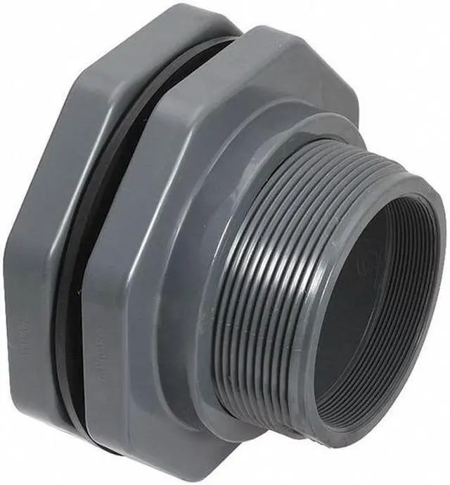 Bulkhead Tank Fitting, Body Material PVC, Pipe Size 6 in, Connection Type FNPT x FNPT, Required Hole Size 8 1/16 in, Gasket Material EPDM, Max. Pressure 150 psi, Max. Wall Thickness 3.25 in, Length 8 in, Temp. Range 40 Degrees to 140 Degrees F, Color Gray. This item has been restricted from sale in the following state (s): []