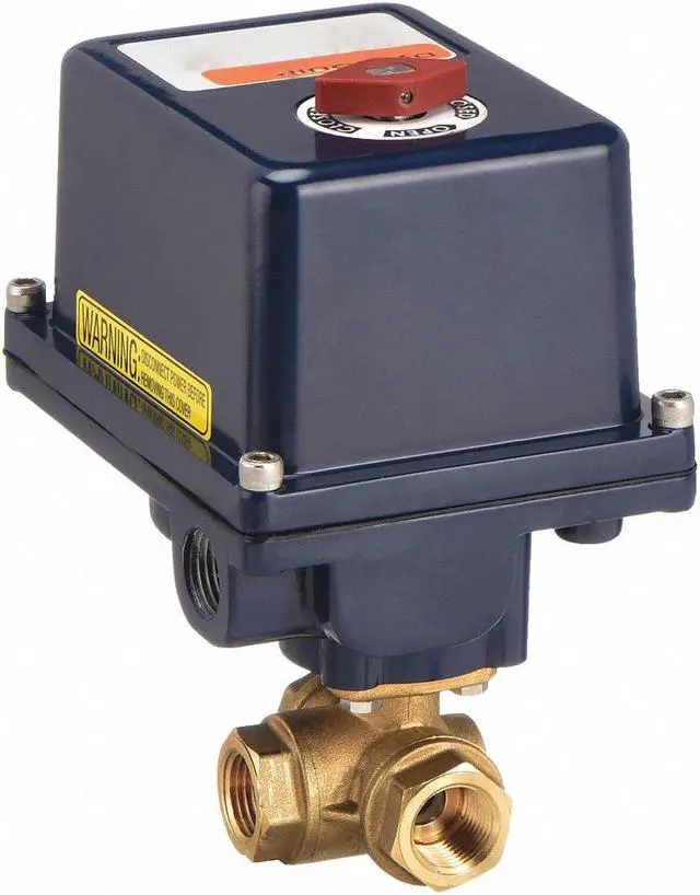 California Proposition 65: This product contains a chemical known to the State of California to cause birth defects or other reproductive harm. Electrically Actuated Three-Way Ball Valve, Valve Construction Two-Piece, Voltage 120V AC, Maximum Pressure - Operating 400 psi, Maximum Pressure - Steam 100 psi, Maximum Operating Pressure Differential 300 psi, Fail Safe Position Fail Last, Actuator Operation 90 Degrees, Actuator Cycle Time - 90 Degrees 2.5 sec, Actuator Features Manual Override, Position Indicator, Thermal Overload Protection, Ball Material Nickel-Chrome Plated Brass, Seal Material PTFE, FKM, Seat Material PTFE. This item has been restricted from sale in the following state (s): []