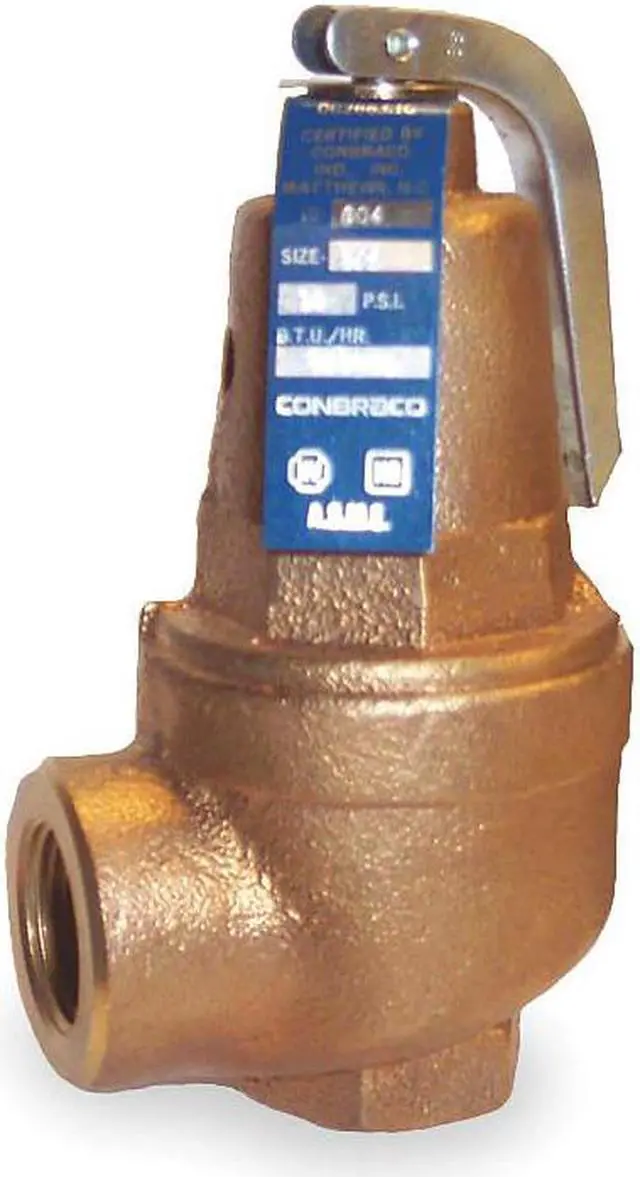 Safety Relief Valve, Body Material Bronze, Inlet Type FNPT, Outlet Type FNPT, Inlet Size 1 in, Outlet Size 1 in, Factory Set Pressure 50 psig, Pressure Range 15 to 160 psi, 1, 956, 000 BtuH BtuH, Disc Material Brass, Overall Height 5 5/8 in, Application Heating, Overall Length 9 1/2 in, Seat Material Silicone, Spring Material Alloy Steel, Temp. Range 0 Degrees to 250 Degrees F, Test Lever Test Lever Included. This item has been restricted from sale in the following state (s): []