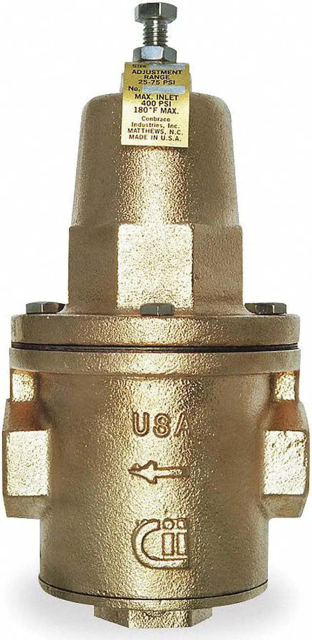 Water Pressure Reducing Valve, Valve Type Super Capacity, Strainer No, Material Bronze, Pipe Size 3/4 in, Preset Pressure Settings 50 psi, Pressure Adjustment Range 25 to 75 psi, Connection Type FNPT, Height 7 in, Length 4 in, Max. Temp. 180 Degrees F, Max. Pressure 400 psi, Standards ANSI A 112.26. 2, ASSE 1003, CSA B356, IAPMO