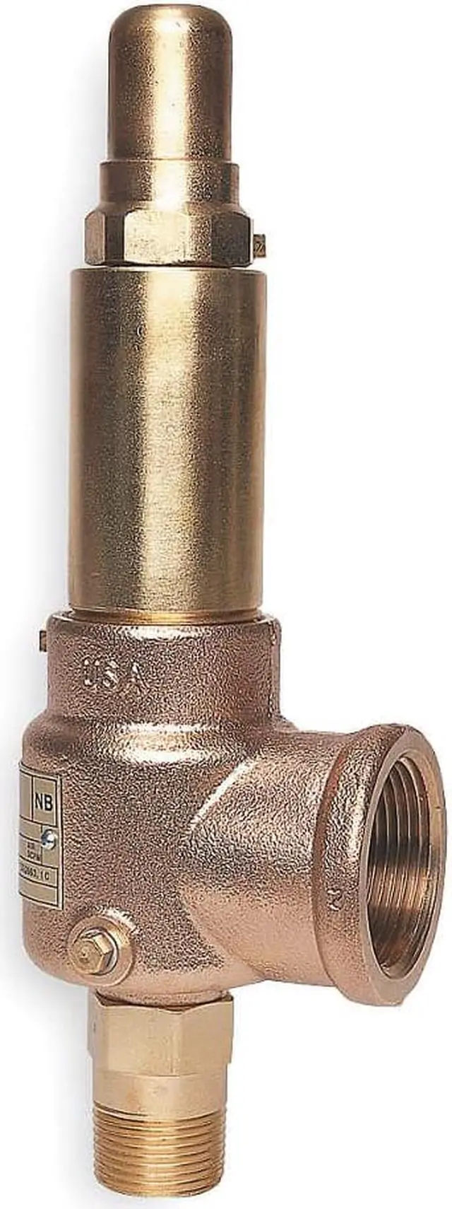POP Safety Relief Valve, Body Material Bronze, Inlet Type MNPT, Outlet Type FNPT, Inlet Size 3/4 in, Outlet Size 3/4 in, Factory Set Pressure 150 psi, Pressure Range 15 to 300 psi, Disc Material 316 Stainless Steel, Overall Height 7 1/2 in, Application Air and Gas Compressors and Dryers, Pressure Vessels and Pressure Piping System etc, Seat Material Metal, Spring Material Stainless Steel, Temp. Range -320 Degrees to 406 Degrees F, Test Lever No, Standards ASME Section VIII UV, CSA CRN, NB.