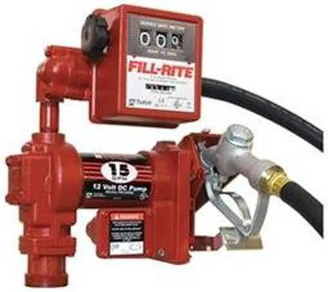 The FR1211H model is a 12V DC, 15 GPM, heavy-duty fuel transfer pump. This pump and accessory bundle comes complete with a meter, hose, nozzle, suction pipe, and installation components.