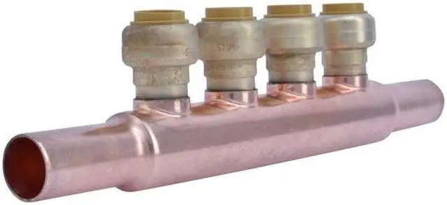 California Proposition 65: This product contains a chemical known to the State of California to cause birth defects or other reproductive harm. Push Fit Manifold, Flow Direction Inline, For Fluid Type Water, For Use On Copper Tube, CPVC Pipe, PE-RT pipe, PEX Tube, Inlet Connection Size 3/4 in, Inlet Fitting Material Copper, Manifold Material Copper, Maximum Operating Pressure 200 psi, Maximum Operating Temperature 200 Degrees F, Number of Inlets 2, Number of Outlets 4, Outlet Connection Size 1/2 in. This item has been restricted from sale in the following state (s): []