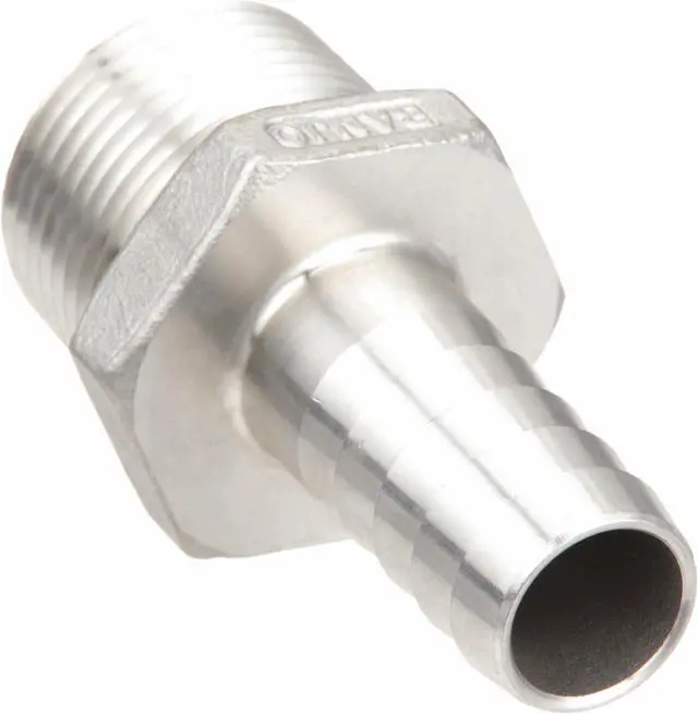 Barbed Hose Fitting, For Hose I. D. 3/4 in, Rigid, Fitting Shape Straight, Fitting Material 316 Stainless Steel x 316 Stainless Steel, Hex Head Size 1 1/2 in, Vacuum Rating Not Rated, Hex, Barb Size 3/4 in, Hose Fitting A Gender Male, Hose Fitting B Gender Male, Hose Fitting A Size 3/4 in, Hose Fitting B Size 1 in, Hose Fitting A Connection Type Hose Barb, Hose Fitting B Connection Type NPT, 316 Stainless Steel, Silver, Reusable Yes, No, Temp.