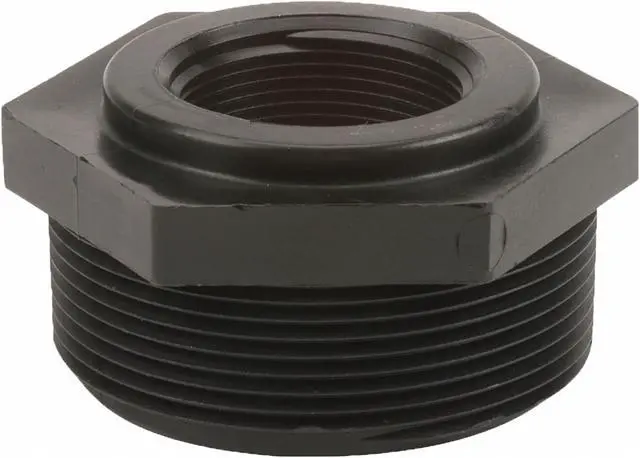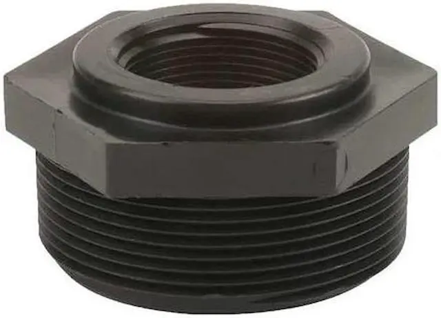 Reducing Bushing, Pipe Fitting Material Polypropylene, Fitting Schedule/Class Schedule 80, Pipe Size - Pipe Fitting 3 in x 1 1/2 in, Fitting Connection Type MNPT x FNPT, Color Black, Max. Pressure 150 psi, Temp. Range -20 Degrees to 150 Degrees F