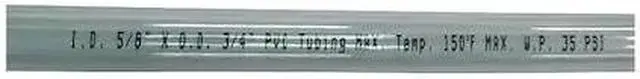 California Proposition 65: This product contains a chemical known to the State of California to cause birth defects or other reproductive harm. Tubing, Application Air, Water, Color Clear, Hardness Shore A 73, Inside Diameter 5/8 in, Jacket Color No Jacket, Jacket Material No Jacket, Material PVC, Material Trade Name Not Applicable, Material Trade Number Not Applicable, Maximum Operating Pressure 35 psi @ 70 Degrees F, Maximum Operating Temperature 150 Degrees F, Outside Diameter 3/4 in, Overall Length 100 ft, Peristaltic Pump Compatible No, PEX Type Not Applicable. This item has been restricted from sale in the following state (s): []