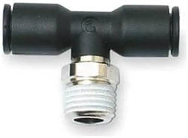 Push-Fit Tee Fitting, Application Air, Cutting Fluids, Inert Gases, Color Black, Fitting Side A Connection Type Push-to-Connect, Fitting Side B Connection Type Push-to-Connect, Fitting Side C Connection Type MBSPT, Material Grade Not Applicable, Includes Pre-Applied Thread Sealant Pre-Applied Thread Sealant Included, Fitting Side C Pipe Size 1/4 in, Fitting Side A Tube Outer Diameter 5/16 in, Fitting Side B Tube Outer Diameter 5/16 in, Fitting Material Fiberglass-Reinforced Nylon. This item has been restricted from sale in the following state (s): []