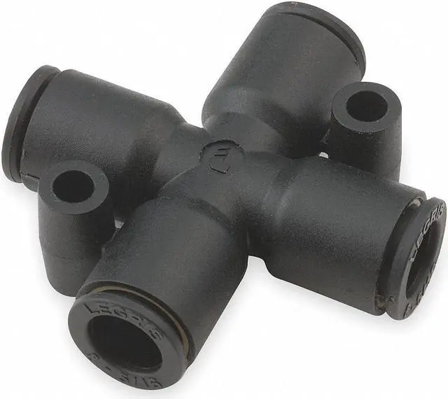 Push-Fit Cross Fitting, Application Air, Color Black, Fitting Side A Connection Type Push-to-Connect, Fitting Side B Connection Type Push-to-Connect, Fitting Side C Connection Type Push-to-Connect, Material Grade Not Applicable, Includes Pre-Applied Thread Sealant Pre-Applied Thread Sealant Not Included, Fitting Side A Tube Outer Diameter 1/4 in, Fitting Side B Tube Outer Diameter 1/4 in, Fitting Side C Tube Outer Diameter 1/4 in, Fitting Material Brass, Fiberglass-Reinforced Nylon. This item has been restricted from sale in the following state (s): []