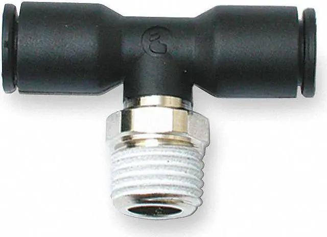 Push-Fit Tee Fitting, Application Air, Cutting Fluids, Inert Gases, Color Black, Fitting Side A Connection Type Push-to-Connect, Fitting Side B Connection Type Push-to-Connect, Fitting Side C Connection Type MBSPT, Material Grade Not Applicable, Includes Pre-Applied Thread Sealant Pre-Applied Thread Sealant Included, Fitting Side C Pipe Size 1/8 in, Fitting Side A Tube Outer Diameter 5/16 in, Fitting Side B Tube Outer Diameter 5/16 in, Fitting Material Fiberglass-Reinforced Nylon. This item has been restricted from sale in the following state (s): []