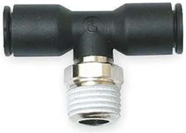 Push-Fit Tee Fitting, Application Air, Cutting Fluids, Inert Gases, Color Black, Fitting Side A Connection Type Push-to-Connect, Fitting Side B Connection Type Push-to-Connect, Fitting Side C Connection Type MNPT, Material Grade Not Applicable, Includes Pre-Applied Thread Sealant Pre-Applied Thread Sealant Included, Fitting Side C Pipe Size 1/4 in, Fitting Side A Tube Outer Diameter 1/4 in, Fitting Side B Tube Outer Diameter 1/4 in, Fitting Material Fiberglass-Reinforced Nylon. This item has been restricted from sale in the following state (s): []