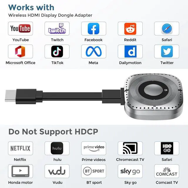 Wireless HDMI display dongle adapter do not compatible with certain paid apps that employ "HDCP" video copyright protection, such as Netflix, Prime Videos, Hulu, Hbo go, Chromcast TV, Xfinity, Vudu, Sky Go, BT Sportetc.