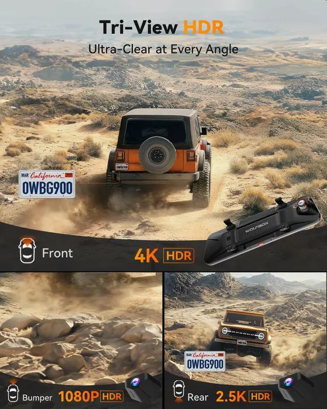 The G900 Tripro 4K dash camera for cars is the ideal choice for those seeking superior car camera - dash cam front and rear capabilities with outstanding video quality. This model features a 4K front camera, a 2.5K rear camera, and a 1080P bumper camera, providing comprehensive coverage for optimal road safety. Whether you're driving during the day or night, the dashcam front and rear camera delivers exceptional clarity thanks to STARVIS 2+HDR technology in the front camera and OS04J10+HDR in the rear camera, while the bumper-mounted camera offers a unique perspective for enhanced terrain monitoring and superior night vision. This makes it an excellent option for a back up camera for cars that excels in low-light conditions. Equipped with built-in 5.8GHz WiFi, this backup camera for car allows seamless wireless connectivity to your smartphone for real-time viewing and file management. The smart mirror dash cam front and rear design integrates smoothly into your vehicle's interior, functioning as both a backup camera rear view mirror and a rearview mirror backup camera. This enhances your safety by providing the convenience of dual functionality in one device. The smart rear view mirror with night vision ensures you maintain control, whether reversing or driving forward. With G-Sensor and parking monitoring features, your vehicle remains protected even when parked. The loop recording functionality ensures you never miss important moments, automatically overwriting old footage. Whether you need a dashcam rearview mirror camera or a digital rear view mirror 4K, this dash cam rear view mirror offers unbeatable performance, including a wireless rear view mirror camera option. Designed with a super capacitor for extreme temperature resistance, and featuring built-in voice control and parking lines, the rear view camera for car is the perfect 3 channel front and rear dash camera for your vehicle. This mirror dash camera provides a comprehensive solution for safe and secure driving, making it the best rearview mirror camera and reverse camera rear view mirror available. At , we are dedicated to providing high-quality, reliable products that enhance your driving experience. With cutting-edge technology and innovative design, our rear view mirror dash cam are trusted by drivers worldwide. Choose for comprehensive protection and peace of mind on the road.