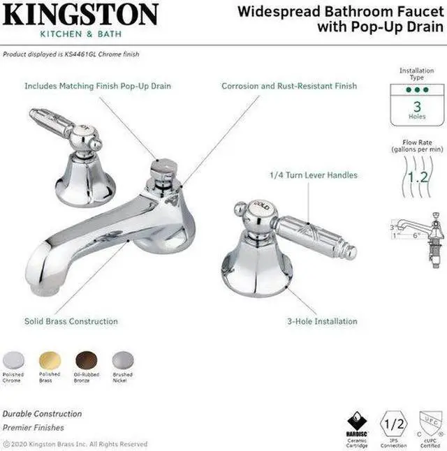 Two Handle Deck Mount- 3 Hole Sink Application- 8 in. to 16 in. Widespread- 3 hole 8 in. to 16 in. center spread installation- Fabricated from solid brass material for durability and reliability- Premium color finish resist tarnishing and corrosion- 1/4 turn On/Off water control mechanism- 1/2 in. IPS male threaded shank inlets- Ceramic disc cartridge- 2.2 GPM (8.3 LPM) Max at 60 PSI- Integrated removable aerator- 5-1/2 in. spout reach from faucet body- 2-7/8 in. overall height.FeatureDrip-free ceramic cartridge systemDesigned for a lifetime of performanceMeets ASME A112.18.1- ANSI/NSF 61 Sec. 9 codeAll mounting hardware includedHandle type - FL.Finish - Oil rubbed Bronze.