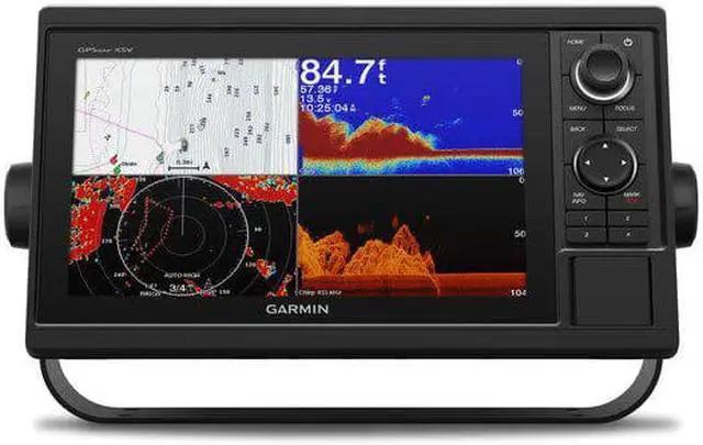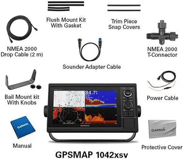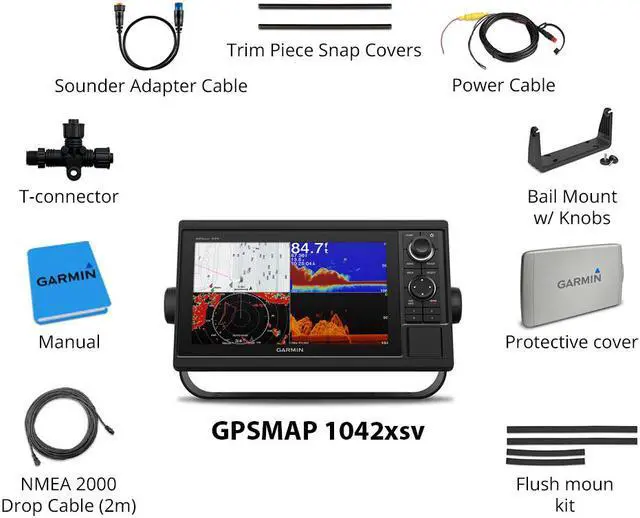 "Garmin GPSMAP 1042xsv The Garmin GPSMAP 1042xsv is a GPS chartplotter and sonar combo that supports all Garmin marine radars. The chartplotter has an 10 inch WSVGA display and keyed control. The GPSMAP 1042xsv comes with built-in high-sensitivity 10Hz Garmin GPS/GLONASS receiver which updates position and heading 10 times per second to display fluid vessel movement and dramatically improve your ability to mark and navigate to 5, 000 waypoints. This GPS chartplotter is designed for cruisers, sailors and sailing racers who need the advanced all-in-1 solution. It Features a large, bright screen coupled with a quick and easy-to-use keypad interface with user-programmable keys and a multifunction control knob.