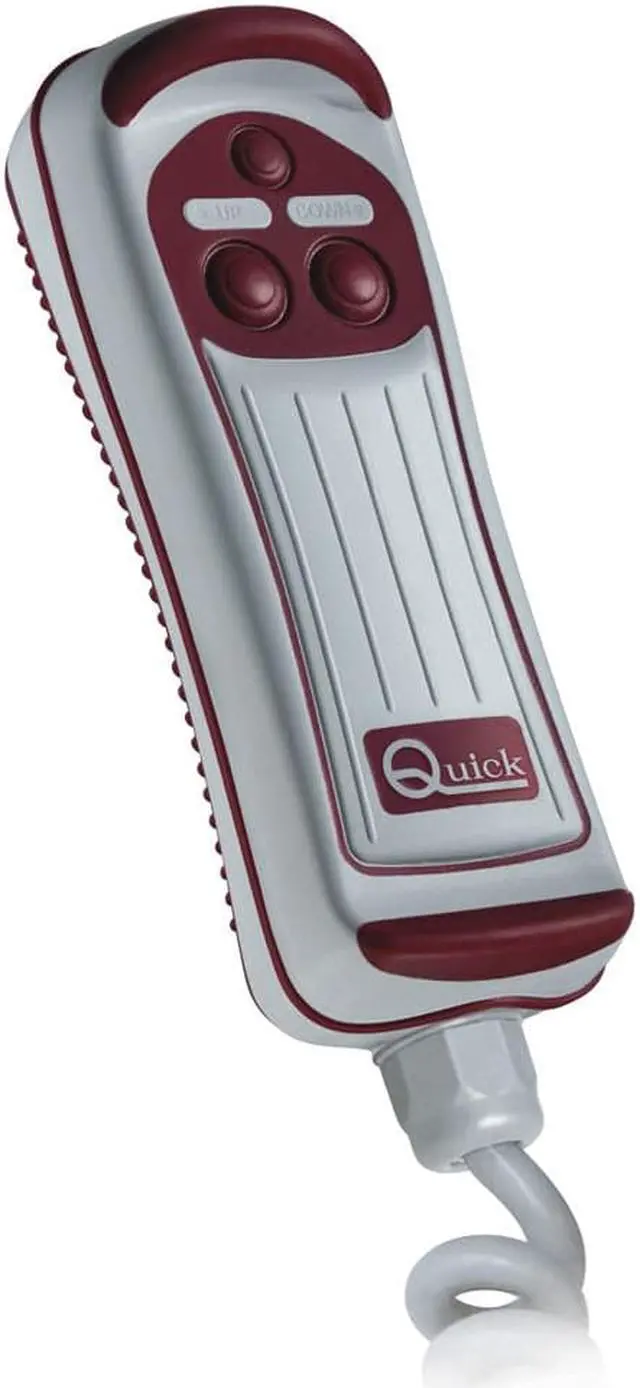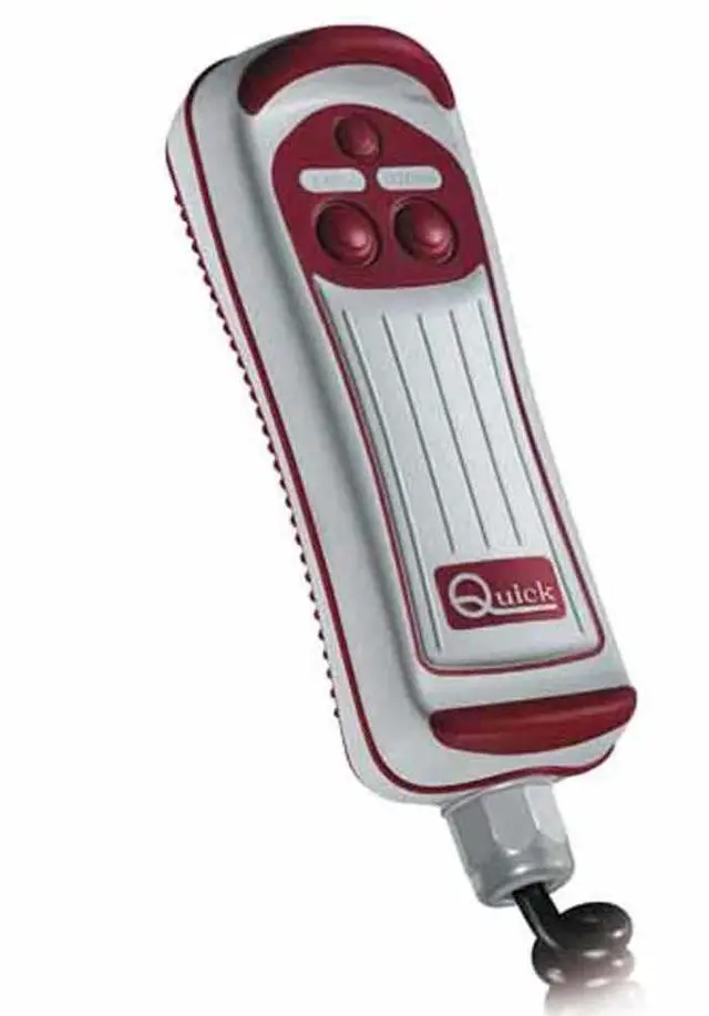 QUICK HRC1002 2 BUTTON REMOTE FPHRC1002000C00HRC1002Multipurpose watertight hand held remote control 2 Button. HRC is the new Quick range of multipurpose hand-held remote controls, designed to for remote operation of various on-board electrically operated equipment such as cranes, gangways, windlasses, sea ladders etc. HRC is constructed with rubber inserts to ensure high strength, long durability, perfect watertightness, and a secure grip. HRC remote controls are supplied complete with a connecting cable extensible up to 4.2 metres, a watertight deck plug and socket, and a support bracket for stowing after use.