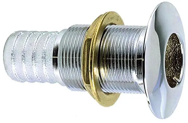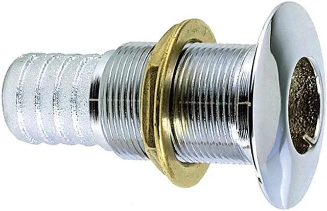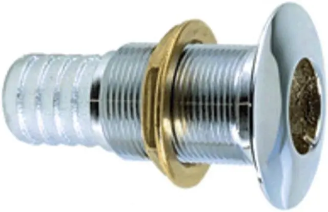 Perko 1 Thru-Hull Connection f/ use with Hose Chrome PlatedBronzeFlange is machined to fit and grooved to retain bedding compound neck isthreaded to approximately 3/16 inch from flange. Cast bronze, plain or chromed brassRegular or short length versionsRegular Length- Fits maximum hull thickness up to 2 inchesShort Length- For thin hull sections up to 5/8 inches maximumTechnical Information Regular Length -