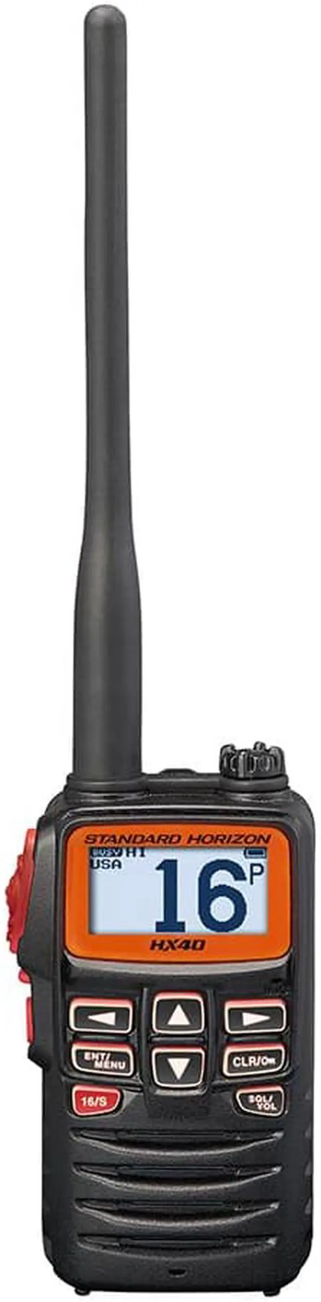 The Standard Horizon HX40 is an ultra compact handheld VHF Transceiver that comes with a FM band. The HX40 comes with an easy to operate menu system with Scanning operation and Multi-Watch (Dual Watch and Triple Watch). It covers NOAA Weather Channels with Weather Alerts. The HX40 features a preset key that can recall up to 10 favorite channels along with a built-in Lithium Polymer battery pack ( 7.4V, 1850mAh).