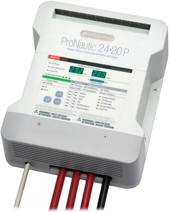 PROMARINER PRONAUTIC 2420P 24V 20 AMP 3 BANK BATTERY CHARGER 63170All Digital Electronic ChargingIndustry recognized with the 2010 IBEX Innovation Award, ProNauticP employs our ProMar Digital Performance Charging Platform which combines all digital control and software-based power conversion technology with global energy management features. ProNauticP addresses the trend of incorporating and using more 12-volt electronics on-board today's power, sail, cruising and sport fishing boats. Boasting twelve digitally-controlled performance charging profiles with finger tip selection, ProNauticP fully charges, conditions, maintains and re-conditions batteries while extending battery life and maximizing battery reserve power performance. ProNauticP is Power Factor Corrected with auto-ranging global AC input allowing all models to operate off a standard household power connection. Featuring dual digital displays for real-time display of actual charging voltage and amperage and AC power-on diagnostics with pass or fail status in addition to discreet fault indication for mis-wiring or adverse battery bank conditions. Designed to provide more time on the water enjoying what you like most... boating.ProMar Digital Performance ChargingProMar Digital Charging Performance - 12 Selectable ProfilesUp to 12 performance & precision 4-stage charging profiles: Charge, Condition, Maintain and Re-condition. Automatic dockside power mode for 12 Volt DC lighting and appliances. Factory set for Flooded (Lead Acid) batteries. AGM, GEL selectable.Power Factor Correction - Global AC InputAuto-ranging (100-250VAC/50-60Hz) global AC input with reduced harmonic distortion allowing all models to operate off a household power outlet connection. ProNauticP consumes less power so more AC power is available on board.Distributed On Demand TechnologyAutomatically senses and distributes 100% of available charging amps to any one bank or combination of all banks.Digital Self-Calculating Absorption and Battery Health Re-Conditioning ModeAutomatically programs conditioning time based on discharge state of batteries. Automatically de-sulfates batteries after 21 days in the maintain mode, improving reserve power performance & extending battery life.Conservation Energy Saver ModeAfter 72 hours of not seeing a load greater than 5 amps, float voltage will be lowered consuming less energy during storage periods. (for flooded & sealed charge profiles) Service and Fault Mode LED IndicatorsReal time indication of wiring faults or adverse conditions that may impact the operation of a boat's charging system.Automatic Fan Speed ControlQuiet operation. Innovative front exhaust prevents restriction of air flow and cooling.Automatic Temperature Compensation and Built-in SafetyRemote temperature probe included - Ignition protected and current limiting. Designed and constructed to: Marine ULc 1236, CE, CTick and FCC Class B. WARNING: This product can expose you to chemicals including di(2-ethylhexyl)phthalate (dehp) which is known to the State of California to cause cancer, birth defects or other reproductive harm. For more information go to P65Warnings.ca.gov.
