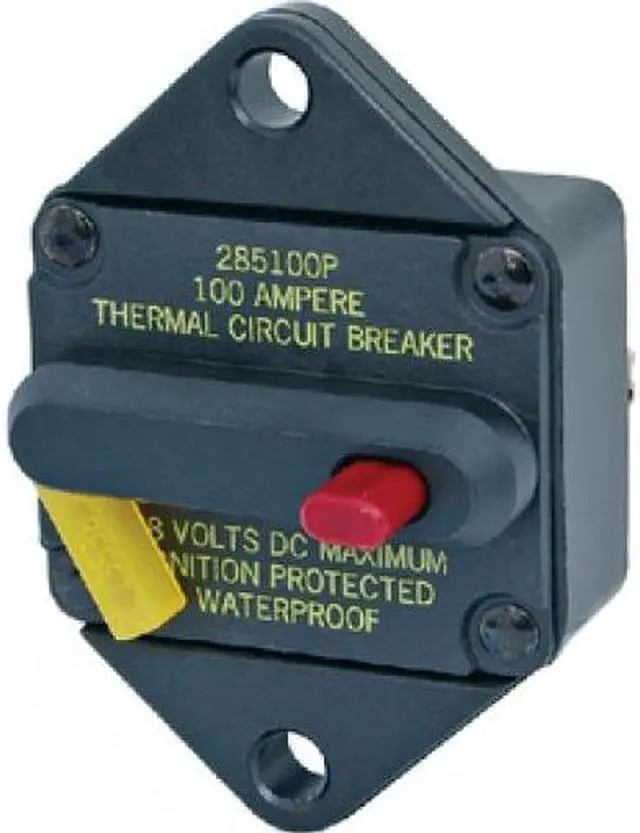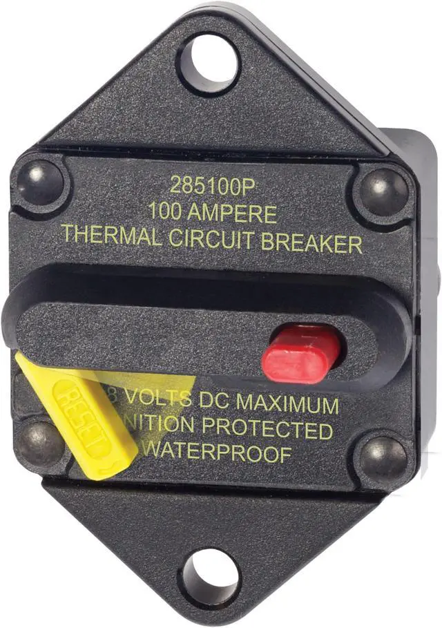 285-Series Circuit Breaker Panel Mount - 100A Drop in replacement for 185-Series Circuit Breakers Visible reset lever shows open condition "Trip Free" - cannot be held closed after trip