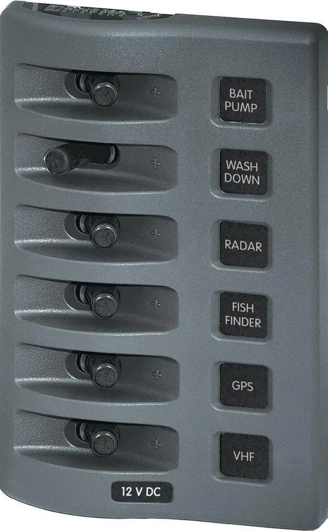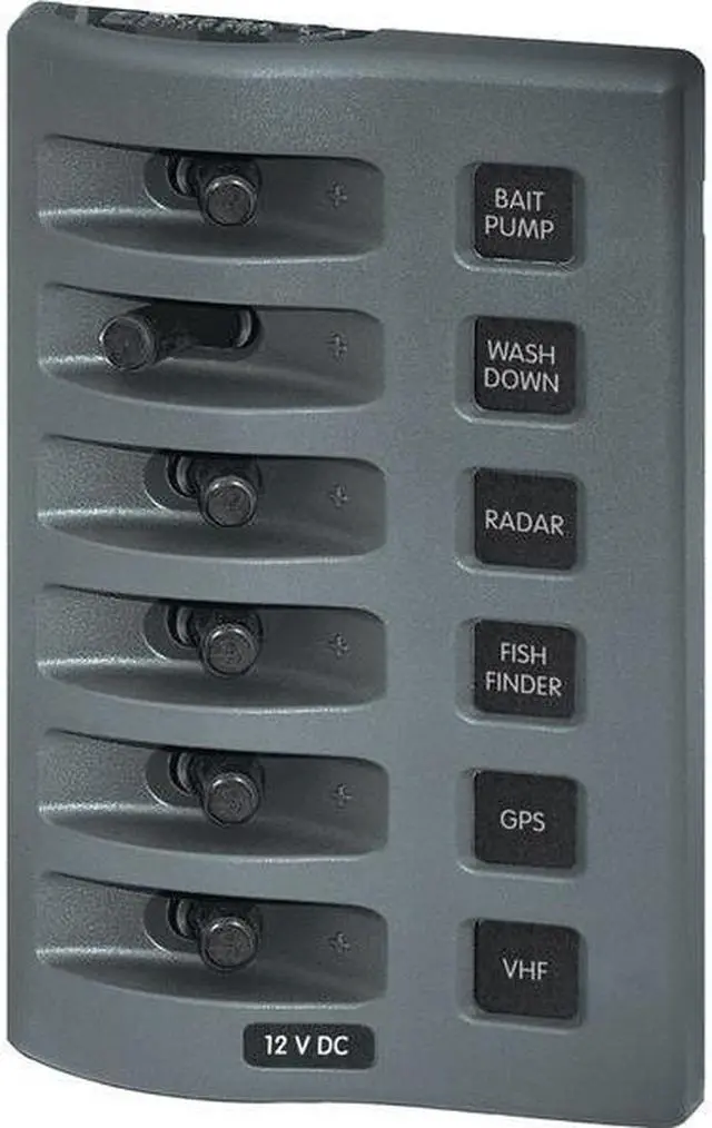 WeatherDeck® 12V DC Waterproof Switch Panel - 6 PositionIntegrated switch guards reduce the risk of accidental switchingPanels can be mounted in four different orientationsPanel front rated IP67 when properly mounted with watertight mounting gasketUV stabilized weather-resistant faceplate snaps on and off providing access to components and concealing mouting screwsWeatherproof: