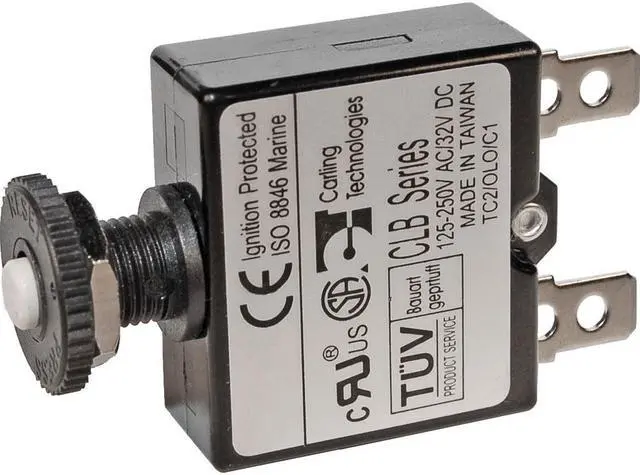 7057Push Button Thermal with Quick Connect Terminals20AIdeal for 24-hour circuit protectionIncorporated into Blue Sea Systems' Waterproof Circuit Breaker panels and main Battery Main Distribution PanelsPush to reset operation"Trip Free" design cannot be held "ON" during fault current conditionIgnition protected - Safe for installation aboard gasonline powered boatsWith male quick connect terminals