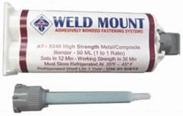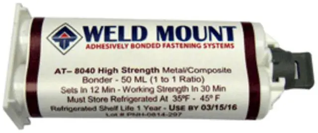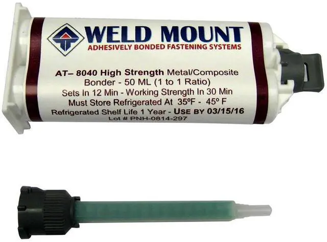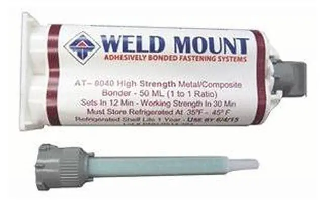 No Slide Metal/Composite BonderRevolutionary Metal Bonder will hold heavy parts at application without sliding either on a vertical or overhead surface. AT-8040 will hold 3,500lbs in 40 minutes. No Welding, Drilling or Tapping.Weld Mount AT-8040 is a solvent free, VOC Compliant, two part methacrylate-based, structural adhesive formulated to bond metals for use in severe environments. It will also bond engineered thermo- and thermosetting plastics, composites to metals or various substrate combinations. It has excellent adhesion to as received metal surfaces including aluminum, stainless steel, galvanized steel, and plated steels. AT-8040 forms a tough, high strength bonds usually with minimal surface preparation developing handling strength in 12 minutes and a functional cure within 45 minutes. Ultimate strength exceeds 3500 psi of tensile shear strength on aluminum with remarkable impact and peel strengths. AT-8040 will hold all Weld Mount parts on a vertical or overhead surface without sagging when properly used.Features:Revolutionary AdhesiveParts Stay Where Placed Without SlidingFor Use Overhead and on Vertical SurfacesNo Need for Fixtures
