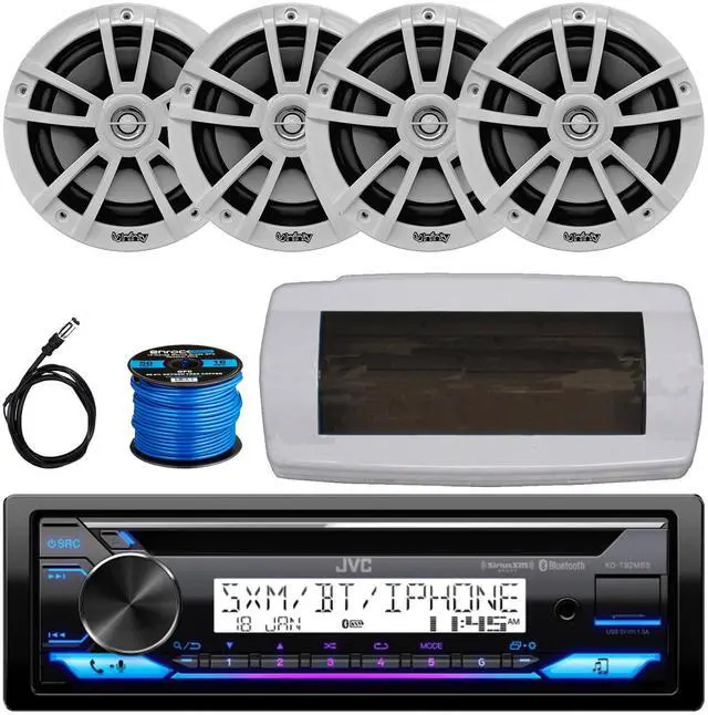 • PACKAGE BUNDLE INCLUDES: JVC KD-T92MBS Single-DIN Marine Bluetooth USB/AUX CD Player AM/FM Stereo Receiver W/White Boat Stereo Splash Cover, 4x Infinity Reference 622MW 6.5" 225W Max Power Waterproof Coaxial Boat White Speakers, 50 Feet 16 Gauge Speaker Wire, 22" Radio Antenna