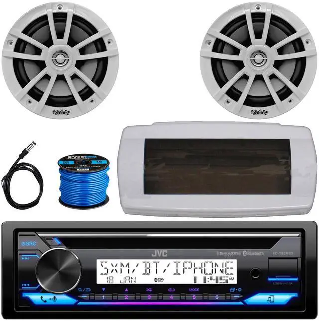 • PACKAGE BUNDLE INCLUDES: JVC KD-T92MBS Single-DIN Marine Bluetooth USB/AUX CD Player AM/FM Stereo Receiver W/White Boat Stereo Splash Cover, 2x Infinity 6.5" 225W Max Power High-Performance 2-Way White Boat Speakers (Bulk Packaging), 50 Feet 16 Gauge Speaker Wire, 22" Radio Antenna