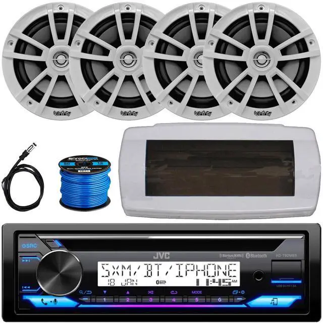 JVC KD-T92MBS Single-DIN Marine Bluetooth USB/AUX CD Player AM/FM Stereo Receiver W/White Cover, 4x 6.5" 225W Max Power High-Performance 2-Way White Boat Speakers W/50 Feet 16 Gauge Wire, 22" Antenna