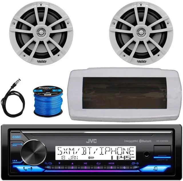 JVC KD-X38MBS Single-DIN Marine Bluetooth USB/AUX LED AM/FM SiriusXM Ready Stereo Receiver W/White Cover, 2x 6.5" 225W Max Power High-Performance 2-Way Boat Speakers W/50 Feet 16G Wire, Radio Antenna